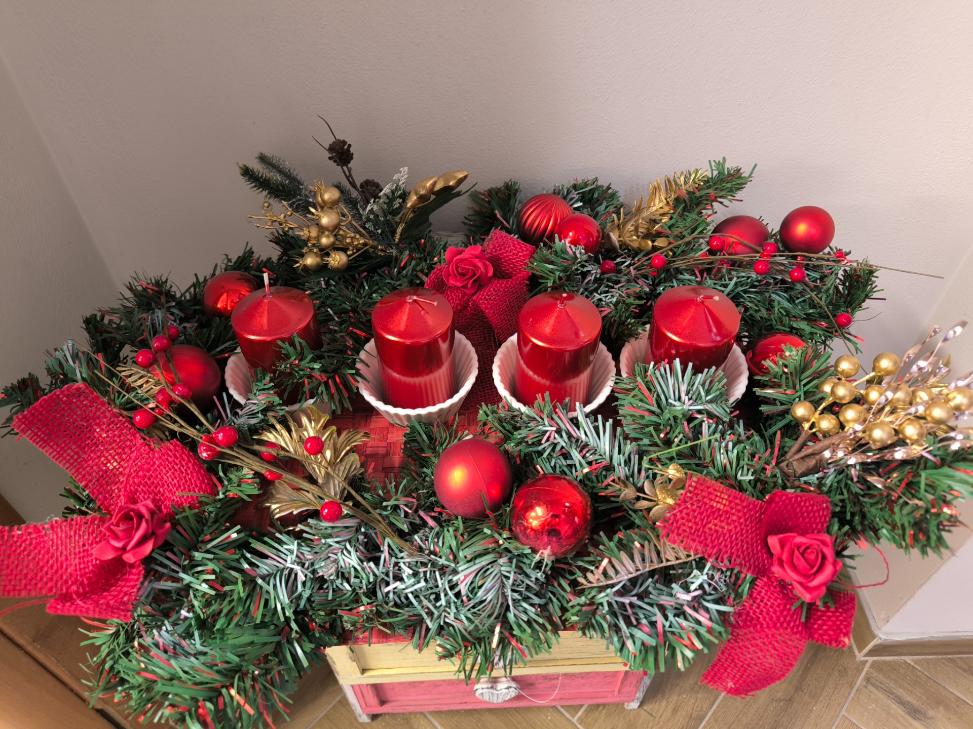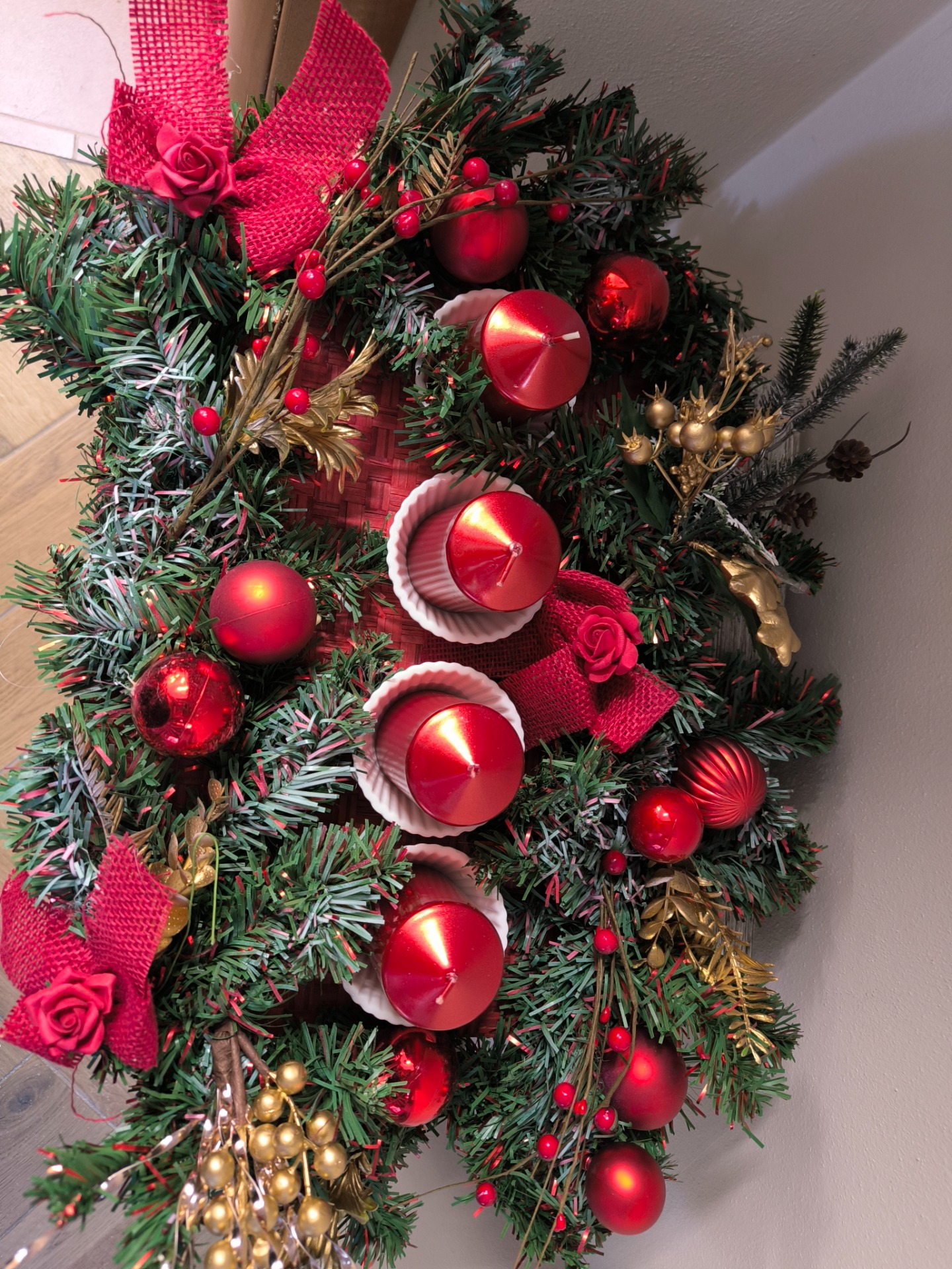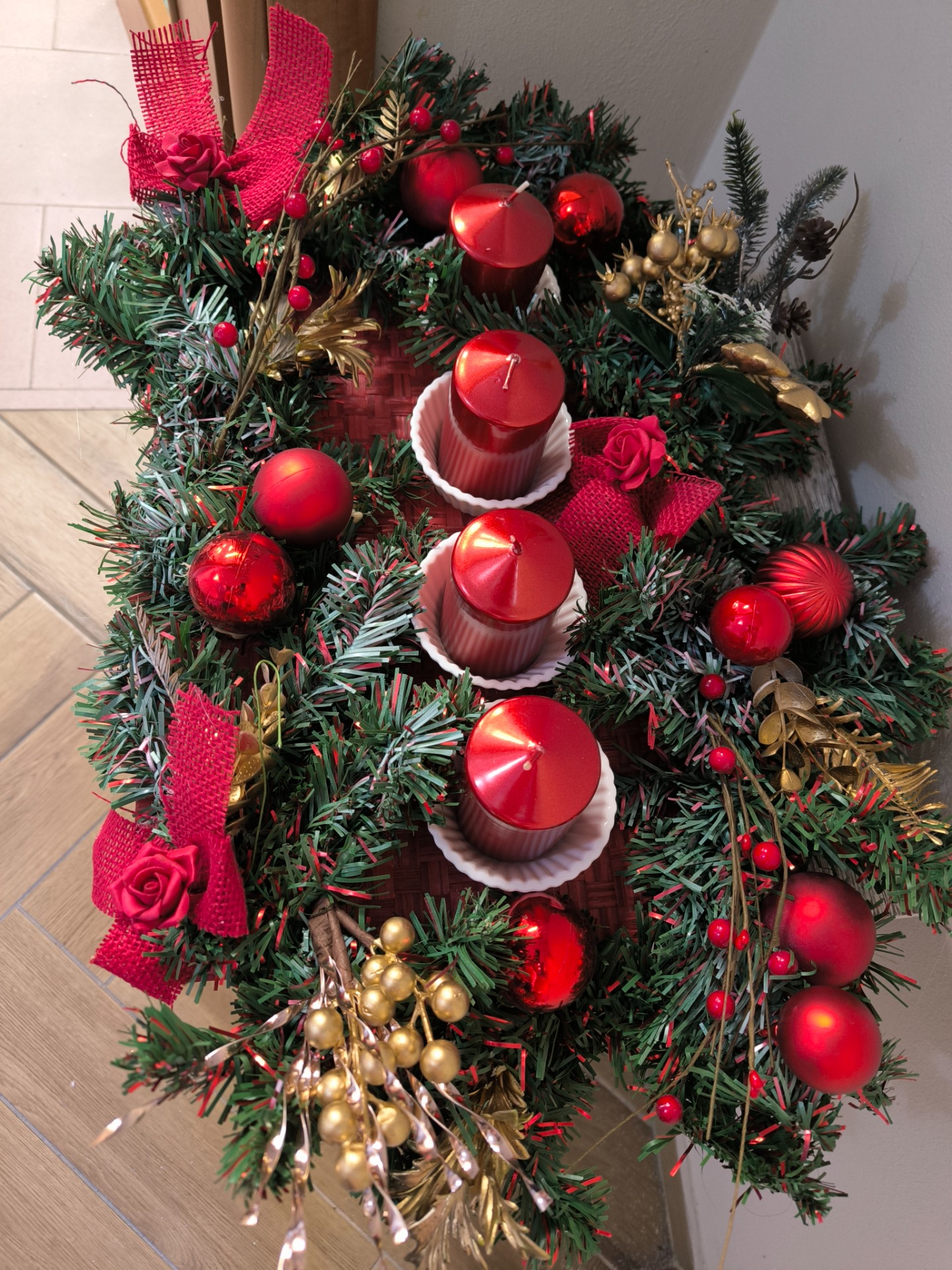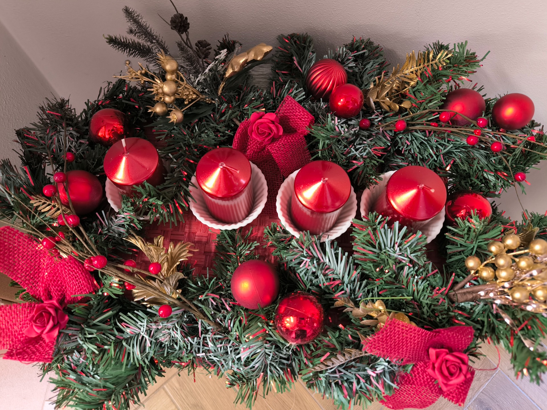 CENTROTAVOLA AVVENTO CM.50X30 CON 4 CANDELE ROSSE E PORTACANDELE