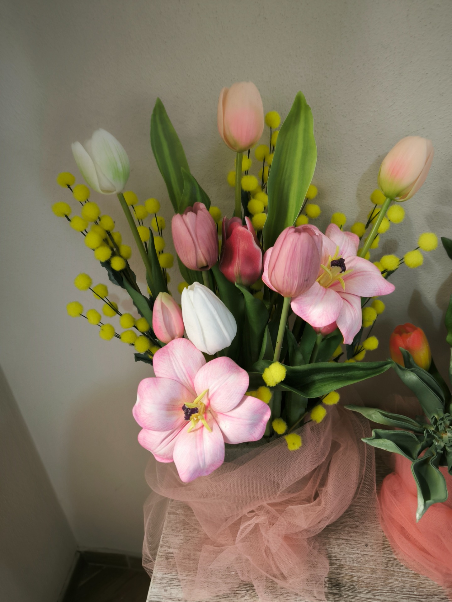 Composizione altezza cm.30 con tulipani e fiori in gomma colori rosa e bianchi