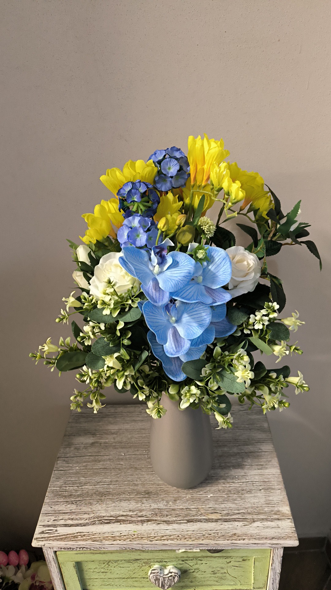 Composizione frontale fresie rose orchidea