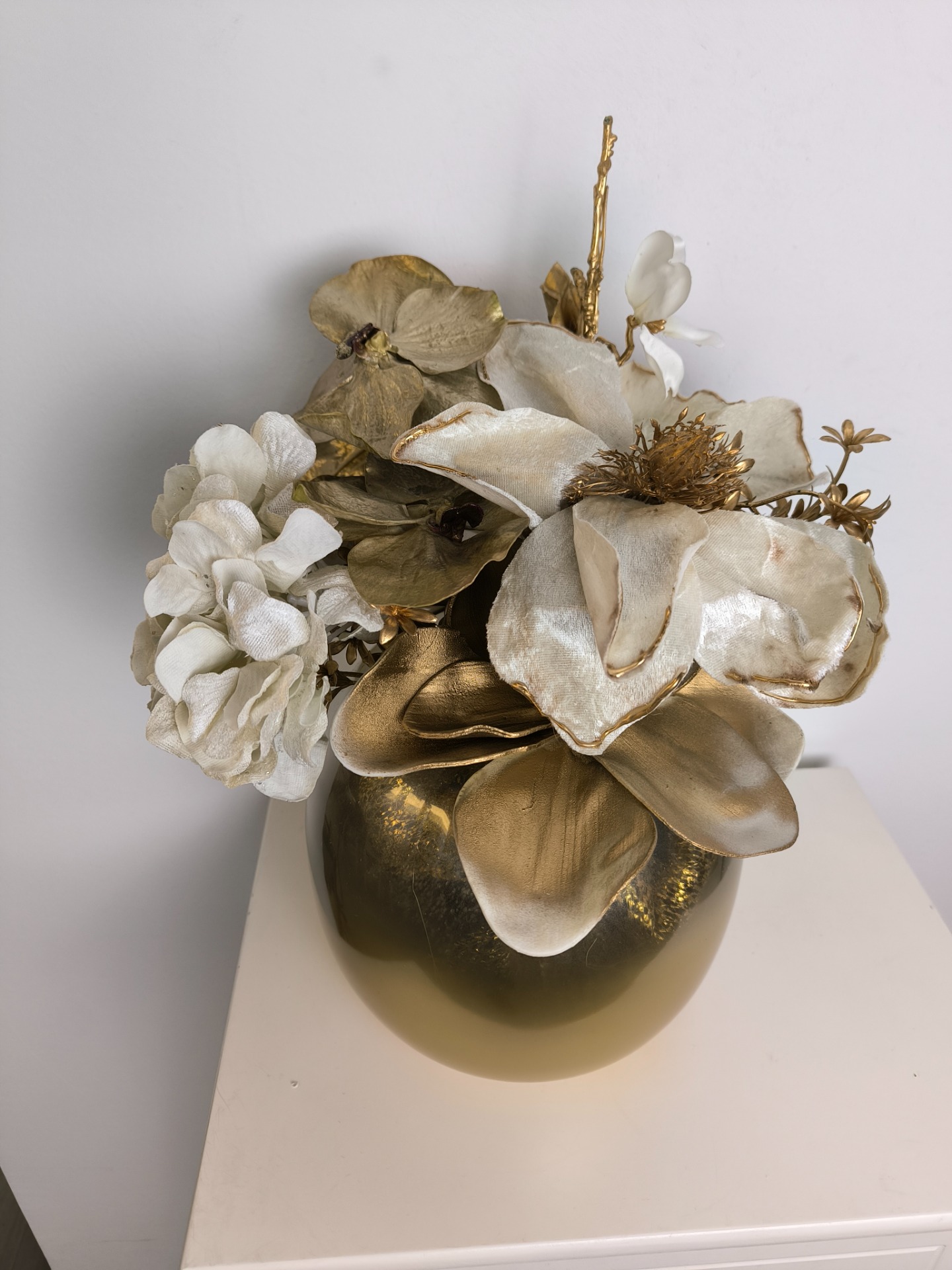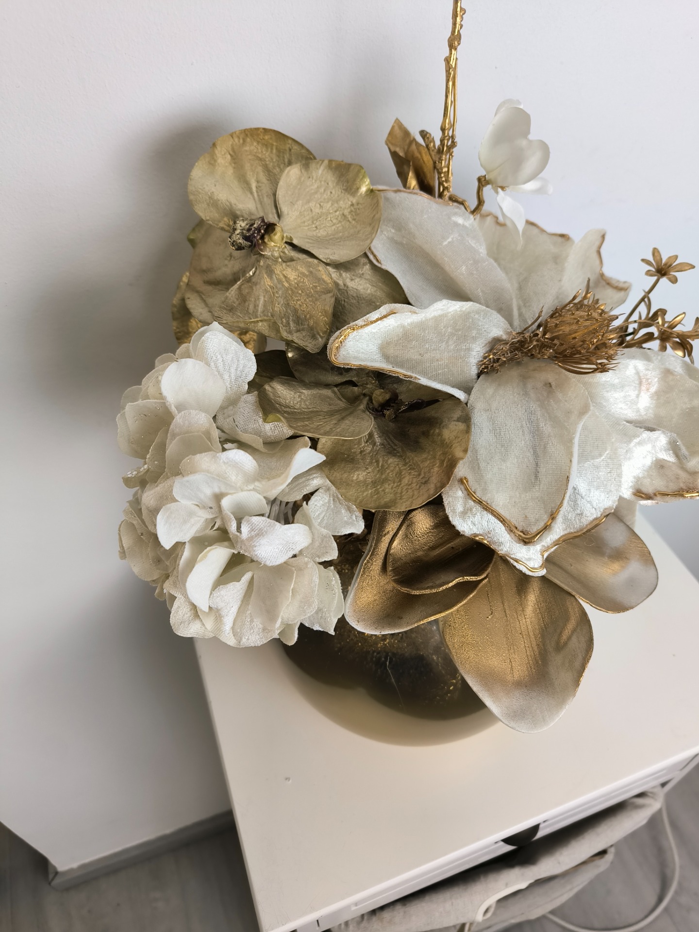 Composizione Natalizia oro e panna su boule in vetro diamo 25 cm. Altezza composizione 40cm