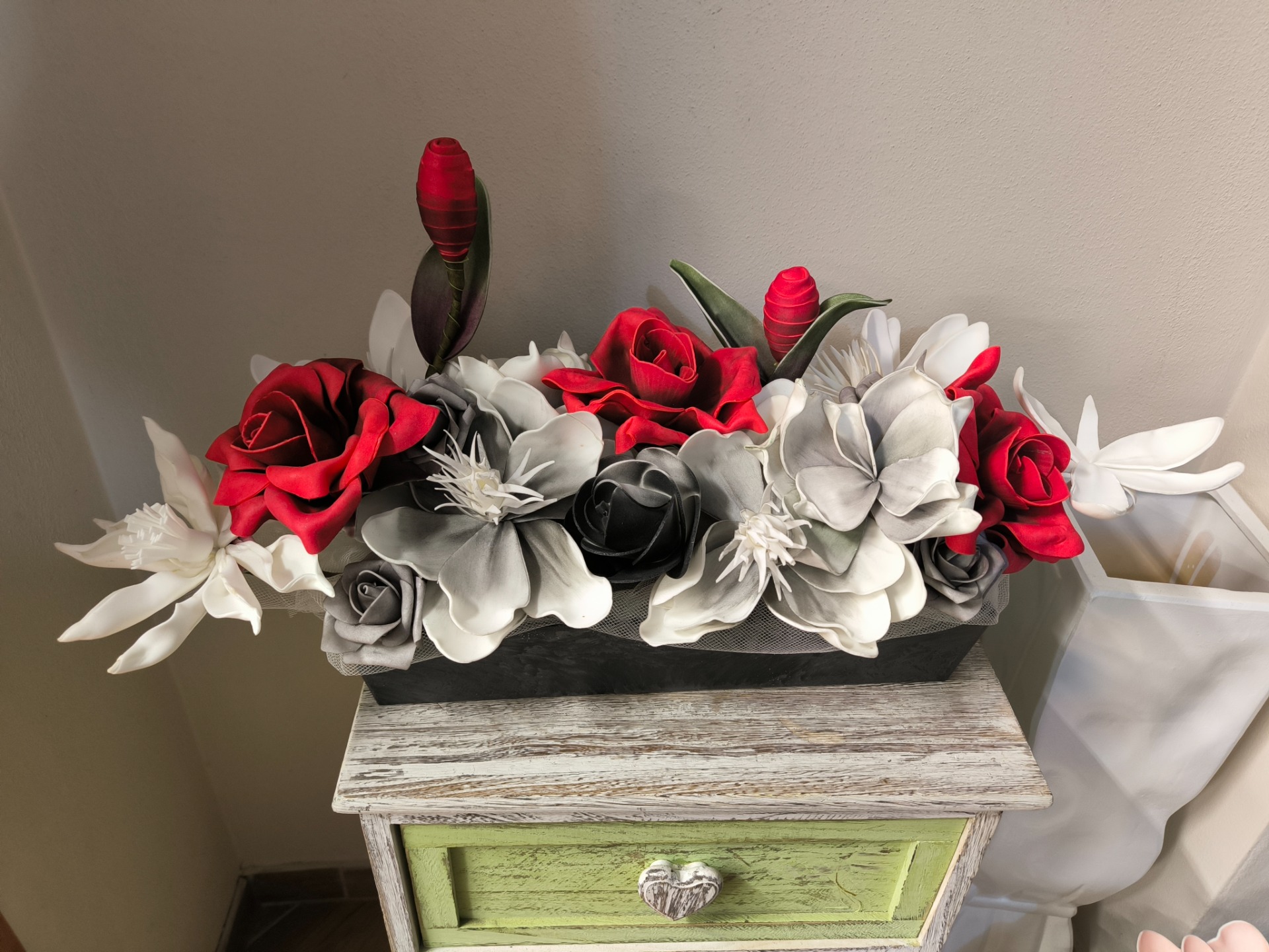 Composizione su base cm.40. totale composizione cm.60 fiori in gonma