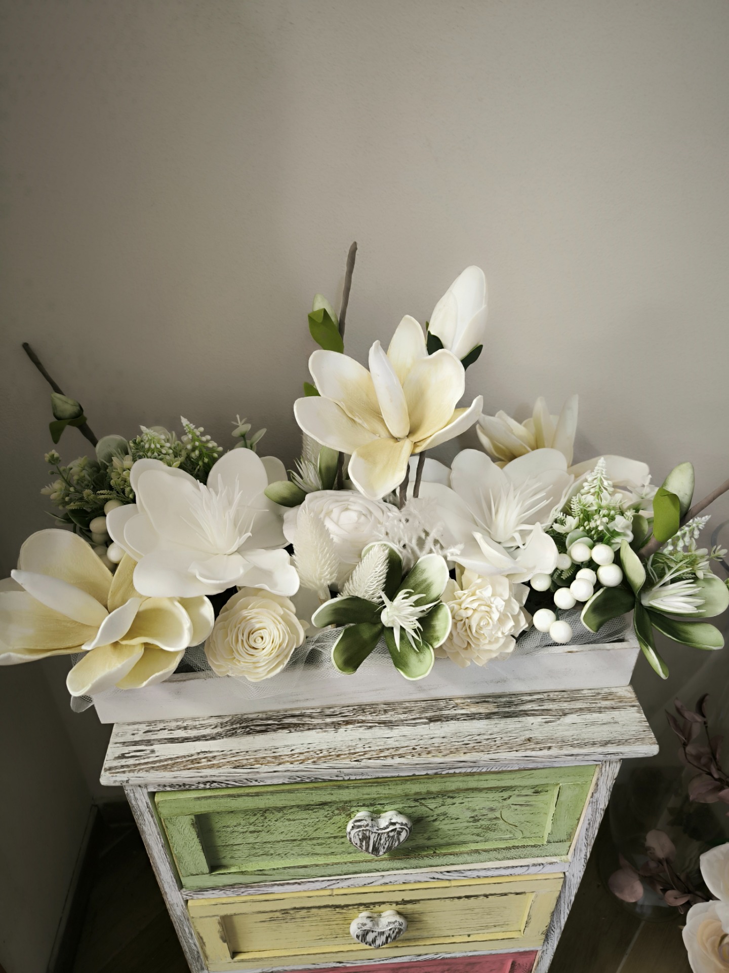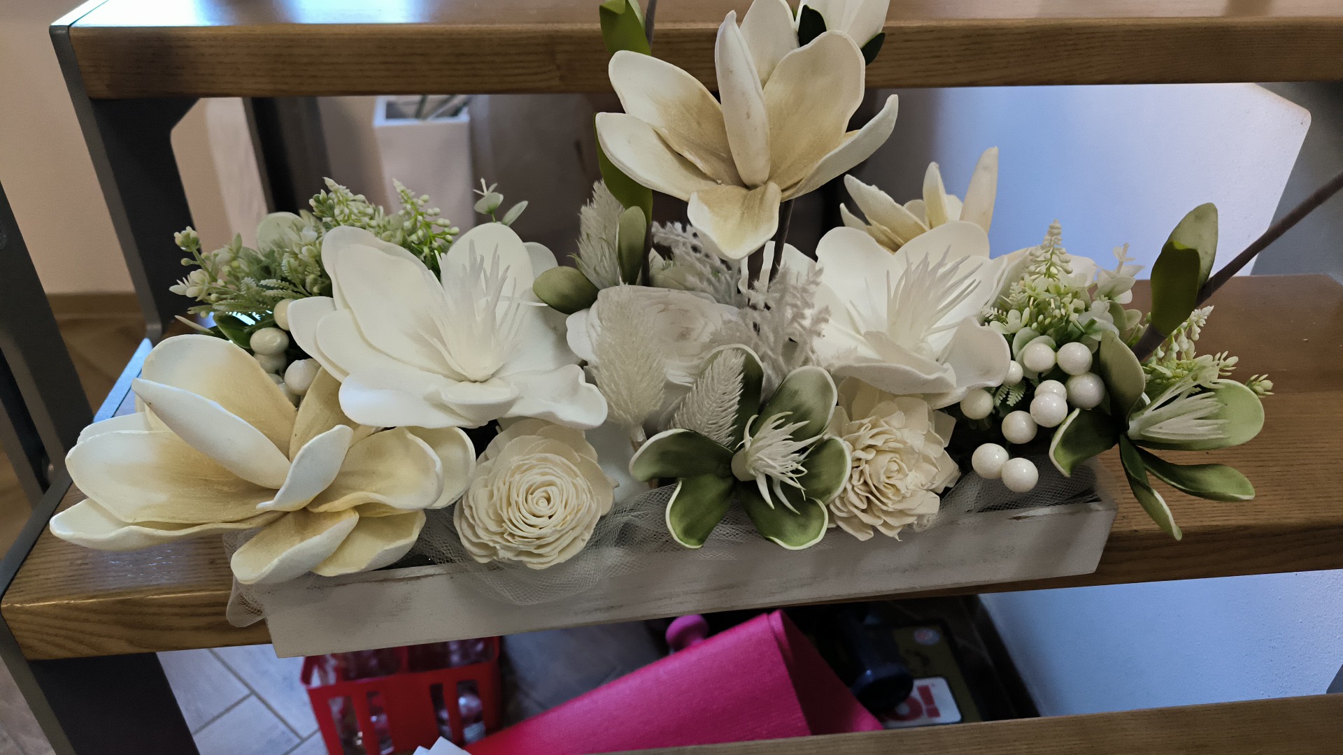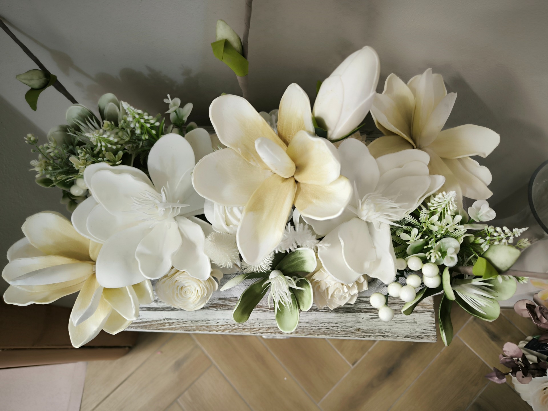 Composizione su base rettangolare in legno fiori bianchi beige e verdi in gomma
