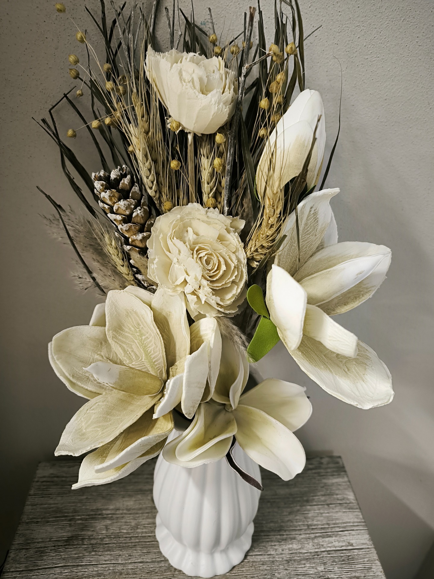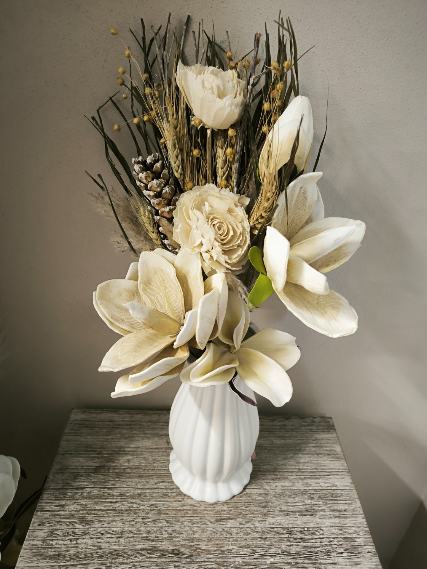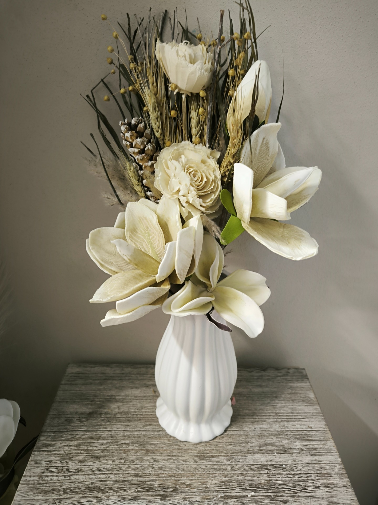 Composizione su vaso porcellana altezza totale 45 cm fiori gomma e legno