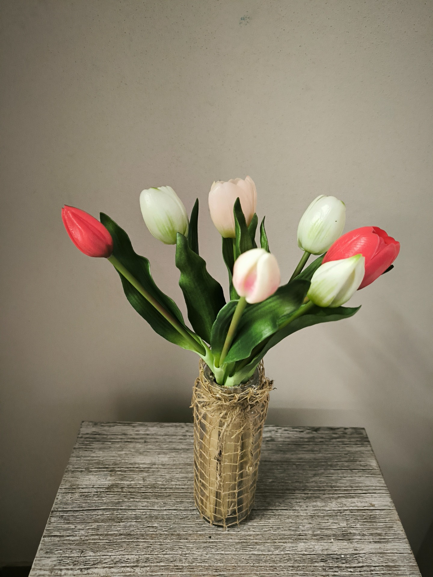 MAZZO TULIPANI IN GOMMA CON VASETTO VETRO E CORDA E LEGNETTI ALL`INTERNO